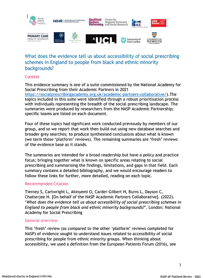 Centre for Regional Economic and Social Research Social and Economic Research InstituteWhat does the evidence tell us about accessibility of social prescribing schemes in England to people from black and ethnic minority backgrounds?