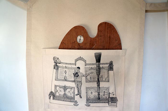 The first series of works Diagrams in Honour of Artist Substance (exhibited at Kunsthuis SYB, Netherlands, 2017 and the ARCADE Gallery London, 2018) invested artistic labour into the materials of the back-stage production of painting (raw canvas, the apron, paint brushes, philosophy books). This research was developed during a residency at the Centre for Philosophy & Visual Arts, Kings College London, where Reeve studied Immanuel Kant’s moral philosophy under Dr John Callanan. Some Diagrams’ became performative; Kant Paint, Won’t Paint! explored the influence of the poet Milton on Kant’s philosophical idea of a good will, insisting on the value of an entanglement of artistic and philosophical forces not usually given credit in mainstream accounts.