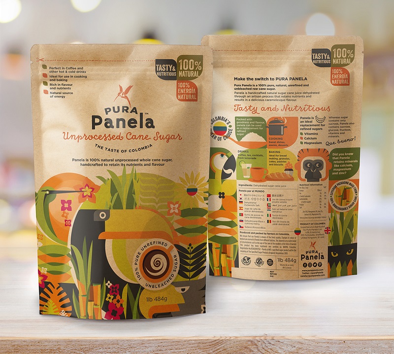 Firstly, Design Futures helped Pura Panela create a new identity to help convey its benefits and origin to the consumer. The new packaging, which is vibrant and eye-catching, has the ability to speak for itself and tell the consumer about the product from the shelf. The team created a design that would work online, in marketing materials and for use in wholesale distribution. \r\nThe redesigned packaging is made from bagasse sugar cane ‘paper’, a renewable resource that does not deplete fossil fuels and is fully compostable. The fully bio-based packaging is created after the locally grown sugar cane has been ‘juiced’ and used to heat the traditional ovens in the artisanal production process.