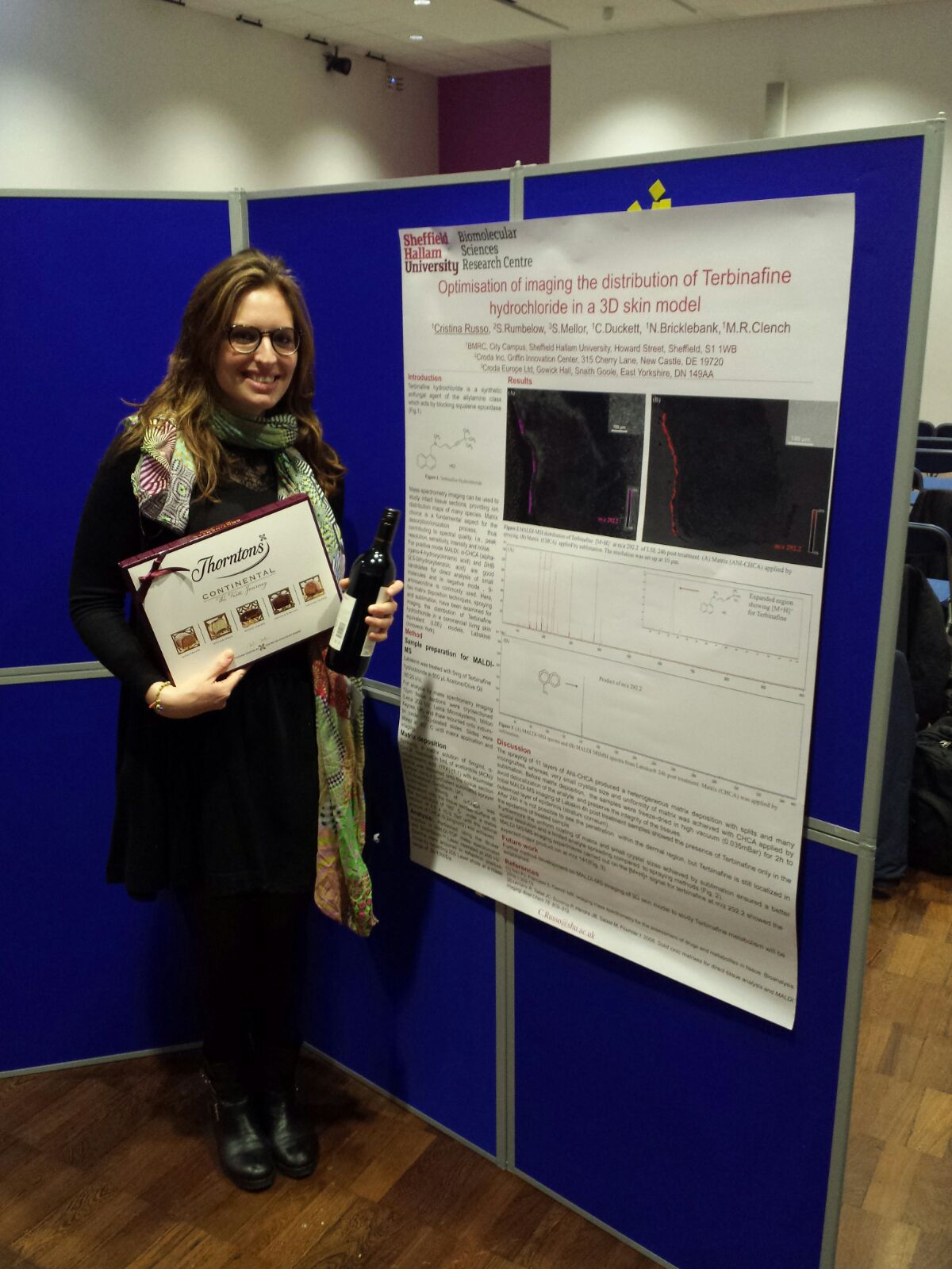 International doctoral student Cristina Russo was awarded Best Poster Prize at this year's British Mass Spectrometry Imaging Symposium. The tile of her poster was 'Optimisation of imaging the distribution of Terbinafine hydrochloride in a 3D skin model'.