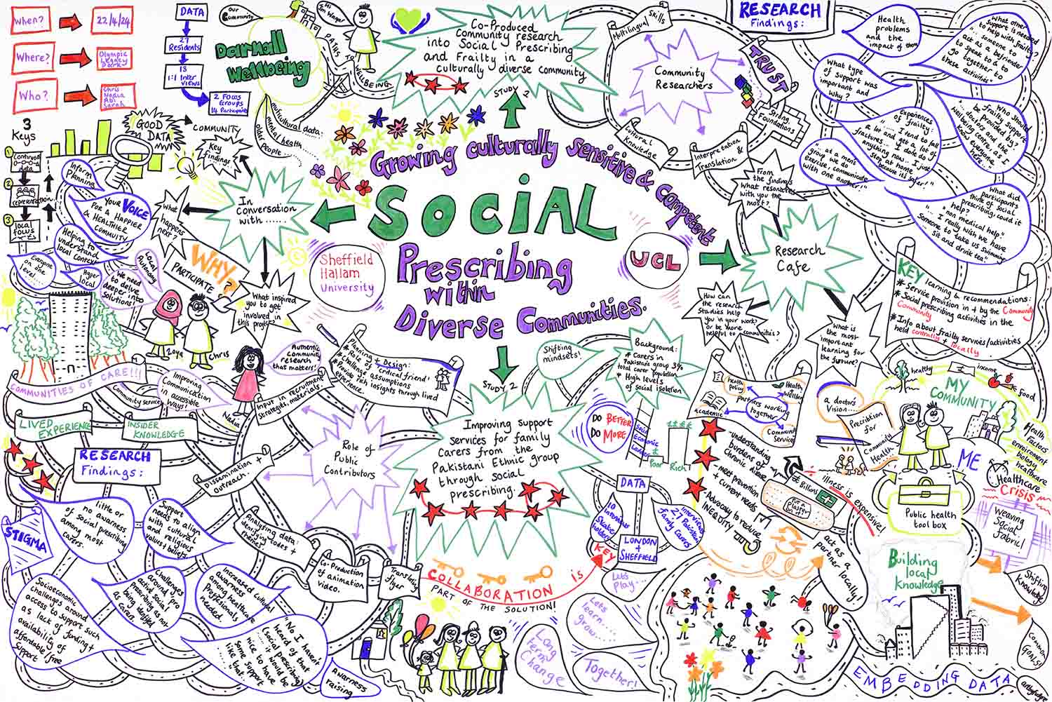- An event on culturally sensitive approaches social prescribing involving community members, practitioners, policy makers and researchers. An artist-in-residence captured the key messages on the day.