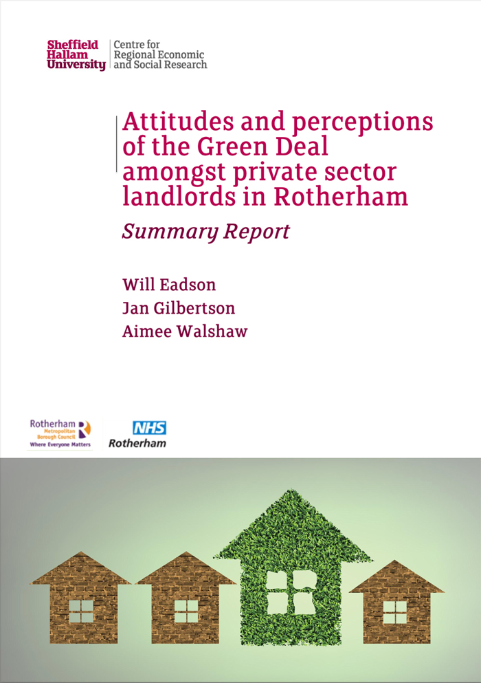 Responsibility for improving energy efficiency levels in the private rented sector lies largely with private landlords. The recent introduction of the Green Deal and the Energy Company Obligation (ECO), which runs alongside the Green Deal, are designed to support the take-up of energy efficient home improvements and are now the main vehicles, other than self-finance, by which private landlords can improve the thermal efficiency of their properties. Commissioned by Rotherham Metropolitan Borough Council (MBC) and NHS Rotherham (Public Health), this project explores the attitudes and perceptions of the Green Deal amongst private landlords. In commissioning this research Rotherham MBC and NHS Rotherham aim to better understand the potential of the Green Deal and ECO to improve energy efficiency levels within the private rented stock in Rotherham, and to identify any ways in which they might support and encourage take up amongst private landlords locally. It is hoped that by working in partnership with private landlords the benefits of Green Deal can be maximised and affordable energy and warmer, more comfortable homes can be achieved for private tenants.