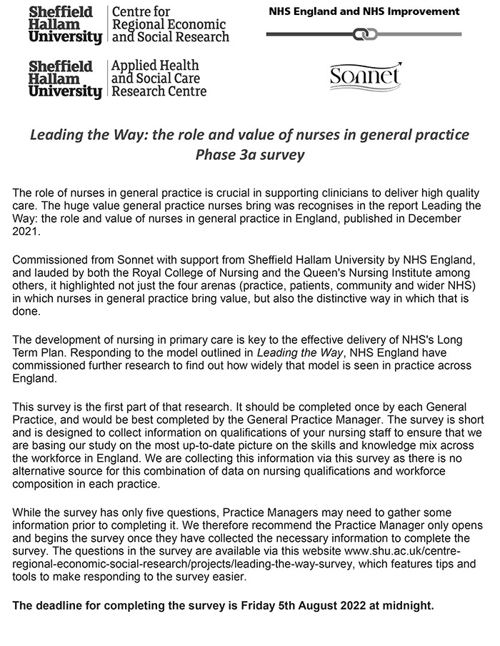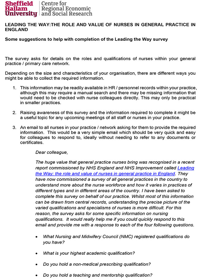 The survey will ask for information on the qualifications of your nursing staff and will help us get a true picture of the skills and knowledge mix in the workforce across England. We are collecting this information via this survey as there is no alternative source for this combination of data on nursing qualifications and workforce composition in each practice.