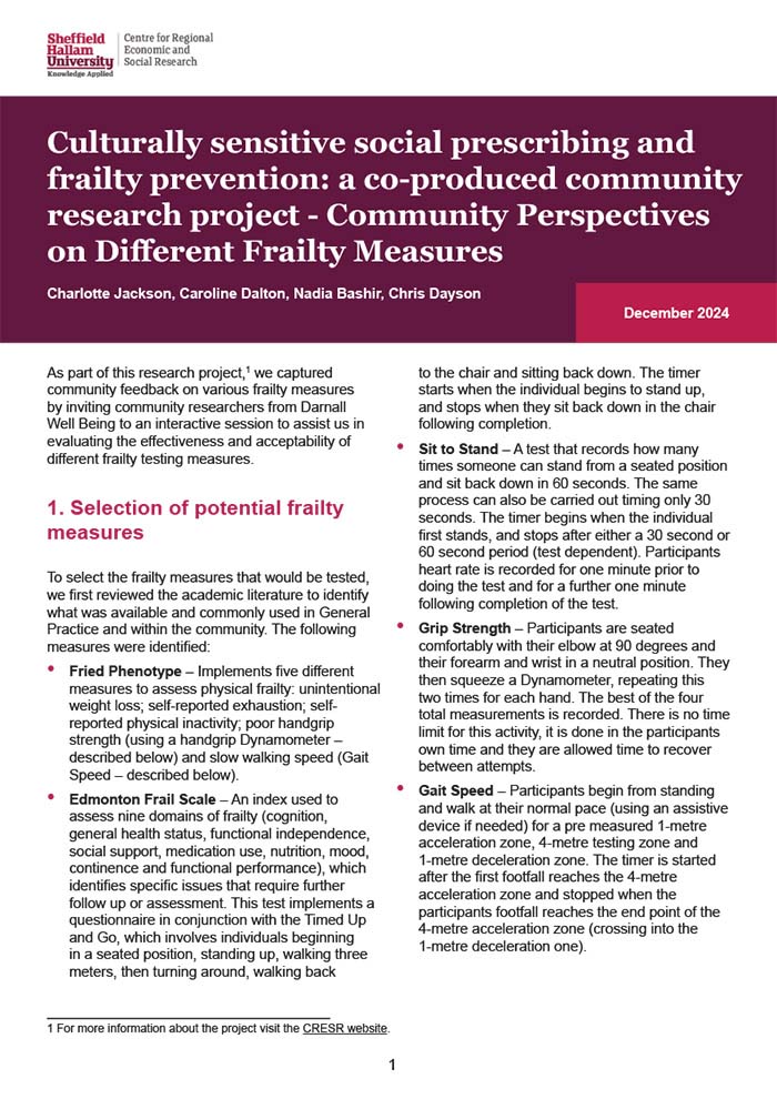 Sheffield Hallam UniversityCulturally sensitive social prescribing and frailty prevention: a co-produced community research project - Community Perspectives on Different Frailty Measures