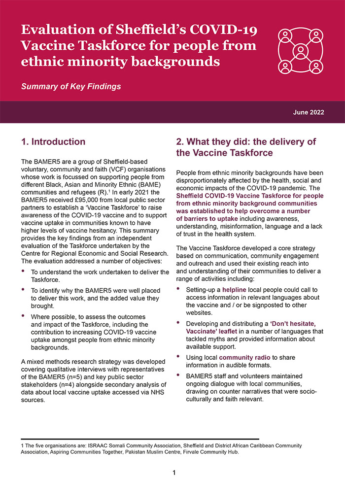 Centre for Regional Economic and Social Research Social and Economic Research InstituteEvaluation of Sheffield’s COVID-19 Vaccine Taskforce for people from ethnic minority backgrounds: Summary of Key Findings
