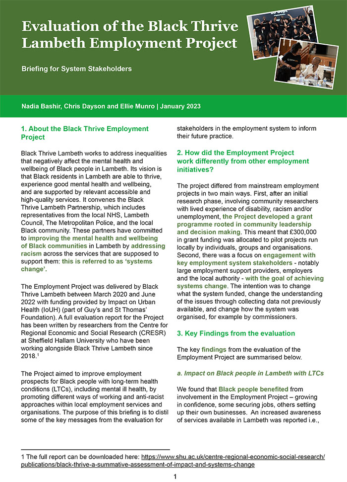 Centre for Regional Economic and Social Research Social and Economic Research InstituteEvaluation of the Black Thrive Lambeth Employment Project: Briefing for System Stakeholders