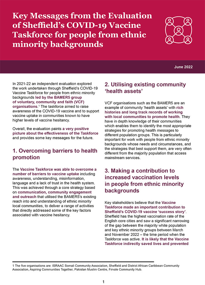Centre for Regional Economic and Social Research Social and Economic Research InstituteKey Messages from the Evaluation of Sheffield’s COVID-19 Vaccine Taskforce for people from ethnic minority backgrounds