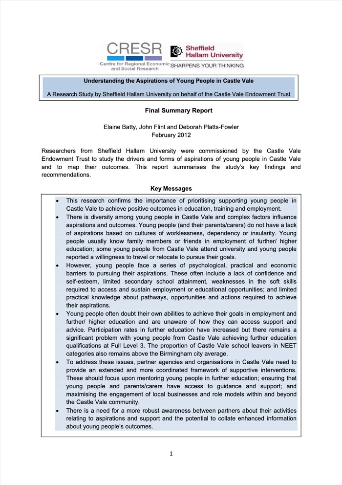 Centre for Regional Economic and Social Research Social and Economic Research InstituteUnderstanding the Aspirations of Young People in Castle Vale