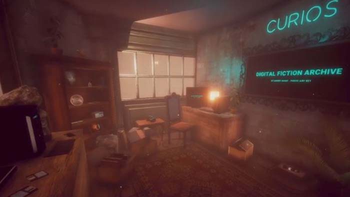 Visitors to the Curios wear an Oculus VR headset to delve into their surroundings. Among the strange clutter of objects and artefacts are stored three important examples of Campbell and Alston's digital fiction: Inside, The Flat and Clearance.