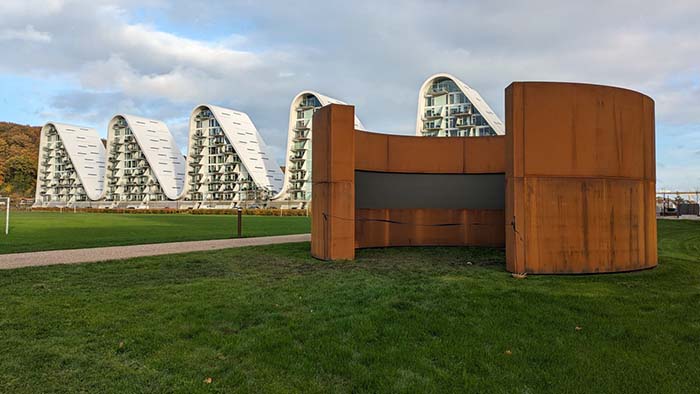 Lise’s installation HavObservatoriet (sea observatory), is a public digital artwork in Vejle, Denmark. The observatory is a circular steel structure, in which the viewer is enveloped by a moving wave on a digital panoramic screen depicting a real-time simulation of ocean waves.