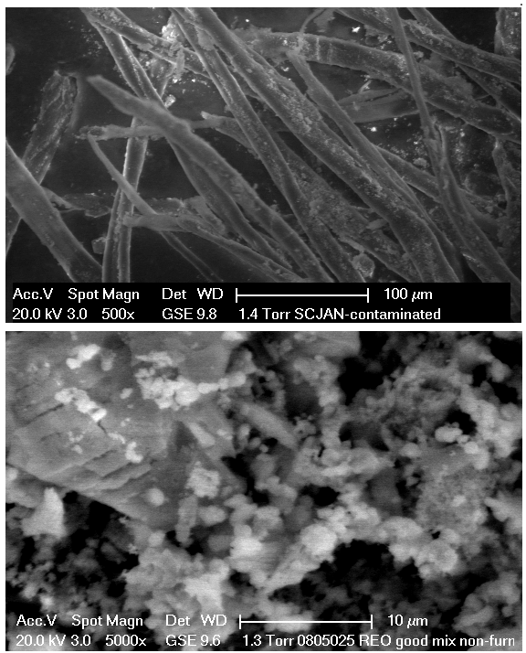 Summary: In conventional SEM, the observation of insulating samples needs to deposit a gold or carbon coating on the sample surface to make it conductive. Direct observation of such samples without Au/carbon coating is available in the Philips XL-30 ESEM and the Nova200 NanoSEM when the instruments are operated under ‘wet’ mode. The upper micrograph shows wool fibres having alumina-type contaminating particles, both of them being electric-insulating. The Al2O3 contaminants were confirmed by EDX chemical analysis. The lower image shows sub-micron features of a refractory material powder of rare earth oxide. EDX spectroscopy showed chemical contents of the oxide mixture including O, La, Ce and Pr.