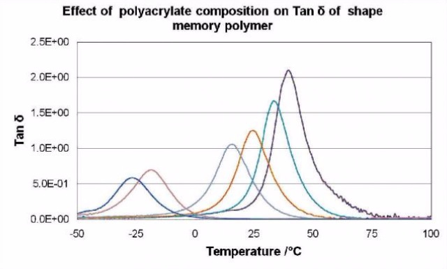 Shape Memory Polymers (SMP), as their title suggest, have the intriguing ability to change from a temporary intermediate shape back to their fixed, permanent shape. In thermoresponsive SMPs the temporary shape is introduced by heating the polymer to a given temperature, Ttrans, and then deforming it into the temporary shape using a physical force. Cooling the deformed polymer, to a temperature below Ttrans, locks in the intermediate shape. When the deformed polymer is reheated to Ttrans the polymer returns to its original, permanent shape. These polymers have been used to produce, among other things, medical devices such as stents and catheters. Typical examples of polymers which can exhibit this shape memory effect include (meth)acrylates, polyurethanes, and blends of polyurethane and polyvinylchloride.