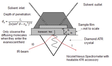 Amphiphilic copolymers of glycerol monomethacrylate (GMMA) and lauryl methacrylate (DM4) crosslinked with ethylene glycol dimethacrylate (EGDMA) have been synthesised in situ by us by free radical polymerisation using azoisobutyronitrile (AIBN) as an initiator. An in-house designed cell has been used to enable the spectral changes occurring during polymerisation and diffusion to be recorded at specific time points during the course of the experiments. The experimental setup is shown in Figure 1.