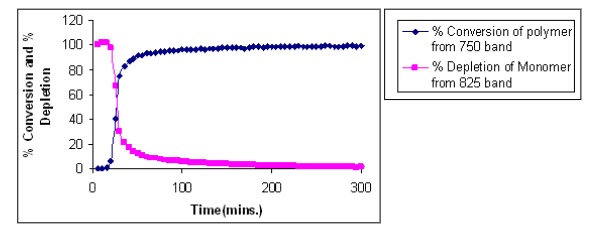 A plot of percentage conversion of the polymer and the percentile depletion of the monomer, calculated using the integrated areas under the 750 and the 815 cm -1 bands, is shown in Figure 5.