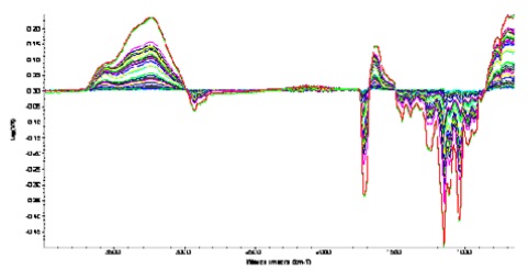 Successive increases in the OH stretch region occurred as the concentration of water in the system increased during the diffusion process. Evidence of hydrogen bonding was obvious from the band shifting to lower wavenumbers. The spectra ratioed against the clean crystal are shown below in Figure 5. Delamination from the ATR crystal occurred towards the end of the diffusion processes.