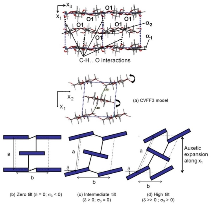Figure. Upper: structure of x1-x3 plane of cellulose Ib. Lower: structure and schematic of deformation mechanism of x1-x2 plane of cellulose Ib under load along chain axis (x3) direction.