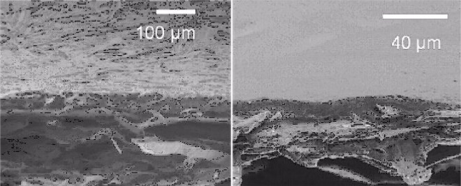 The electron micrographs in Figure 1 show how the starch:clay coating makes the rough, fibrous surface of the uncoated paper much smoother by forming a continuous, coherent film on the paper substrate. There are many commercial coatings that do the same thing – but they rely on petroleum derived chemicals to achieve it.