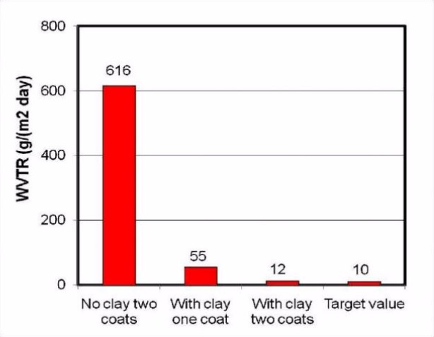 The starch:clay coating has a profound effect on the Water Vapour Transmission Rate (WVTR) (Figure 2) reducing it from 616 g per square metre per day to 12 g per square metre per day. This latter value is extremely competitive with that obtained using the oil-derived counterparts.