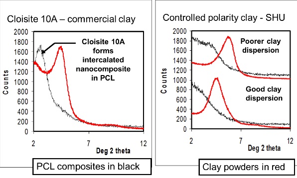 Figure 1. Comparing the extent of dispersion of a commercial clay, Cloisite C10A (Left), and the mixed modifier clays prepared at SHU (right) in polycaprolactone using x-ray diffraction analysis. The presence of a peak in the x-ray trace of the sample on the left confirms that an intercalated nanocomposite had been formed. The absence of a peak in the black traces on the right suggests that the mixed modifier clays dispersed much better in polycaprolactone. This interpretation was confirmed using transmission electron microscopy Figure 2.