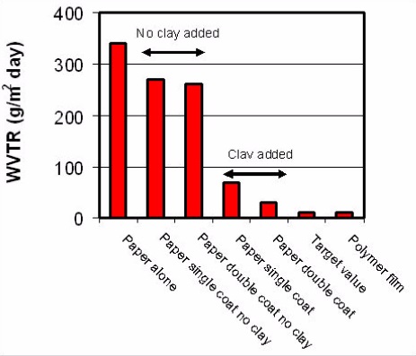 Figure 4. The reduction in water vapour transmission rate when clay is added to a starch:plasticizer coating formulation. The value of ca. 50 g per metre squared per day is directly competitive with commercial, petroleum derived barrier coatings.
