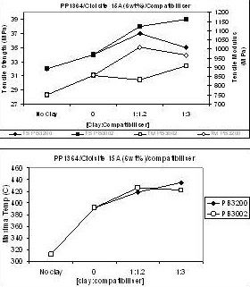 The improvements in tensile and thermal properties were similar for all the different organoclays and showed that, at the extent of dispersion achieved in the nanocomposites, no major effects due solely to the different organoclays were evident. It was noted, however, that in the absence of compatibiliser the interlayer spacing of the commercial organoclay decreased, whereas no decrease was observed for those manufactured at Sheffield Hallam. A representative selection of the thermal and tensile data collected at Sheffield Hallam is presented in Figure 4.