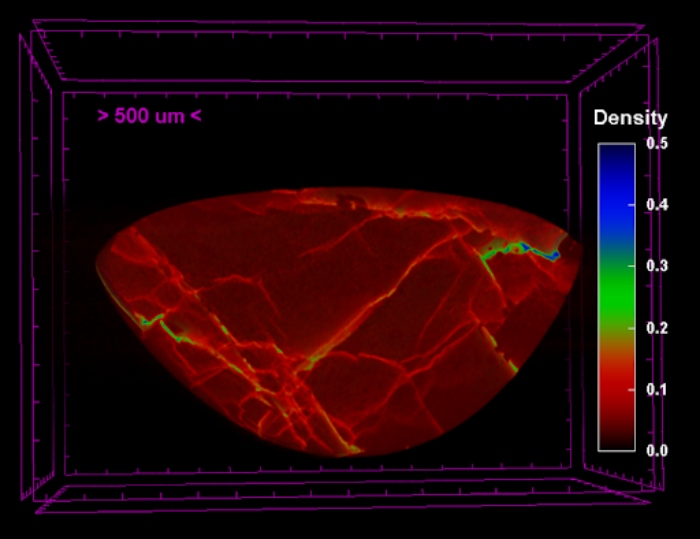 The µCT was also able to detect lead-glass infill in a heavily fractured ruby (Figure 1). Differences in infill material versus original ruby were able to be separated by density to create a 3D map of the microfracture profile (Figure 2).