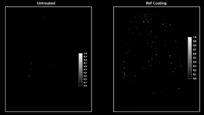 The resulting 3D images of untreated and Reference coated seeds were pseudo-coloured for density. This provided a clear picture of how the seed coatings were distributed, as shown below.