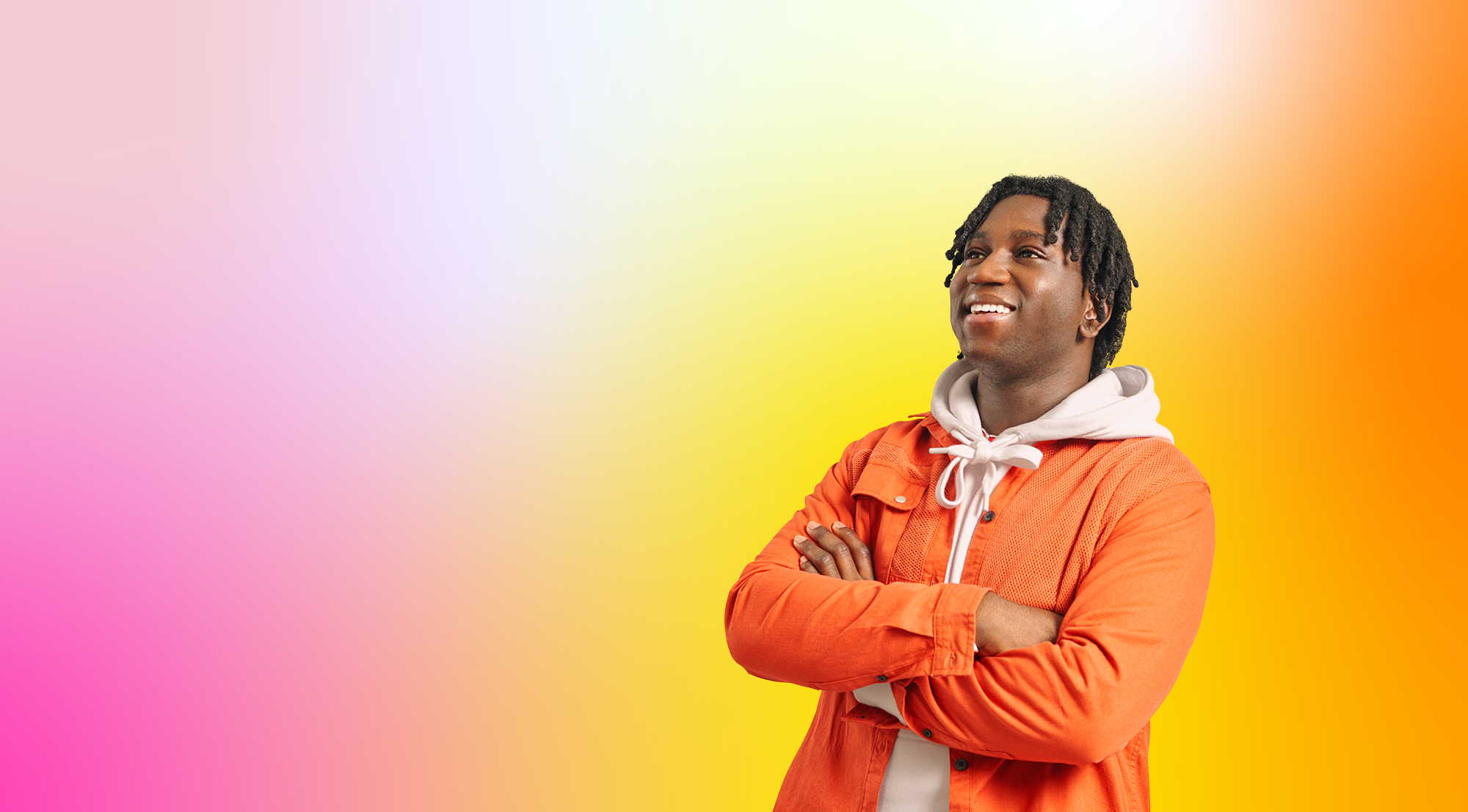 A smiling person in a pink and white striped shirt standing confidently with their arms crossed, on a colourful gradient background.