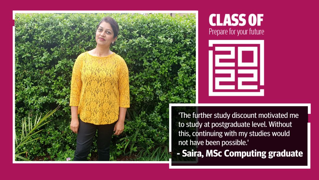 Saira studied an undergraduate degree in BA (Hons) Primary Education 5-11 with QTS and now studies MSc Computing with the help of the Class of 2020 further study discount - now available for Class of 2023 students in their final year.