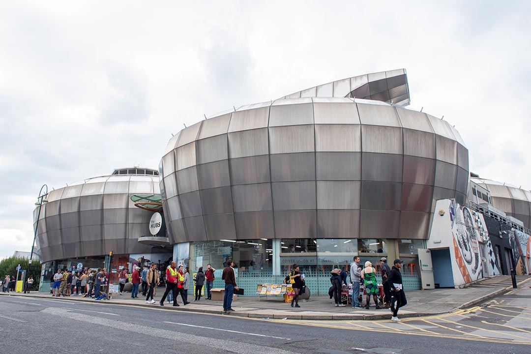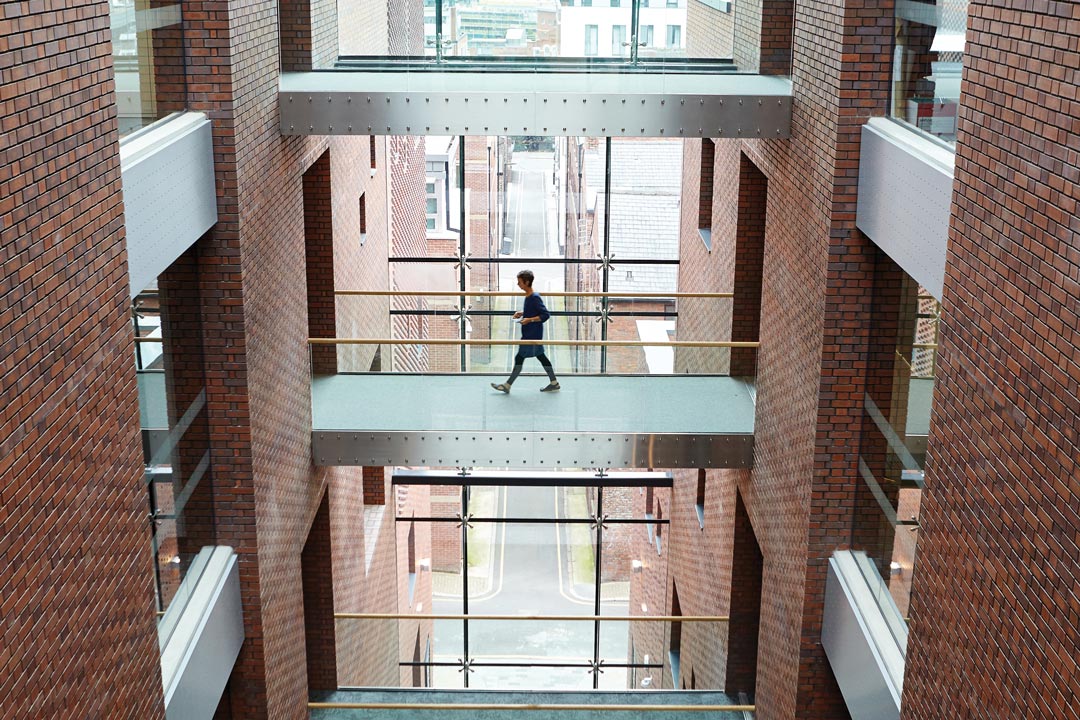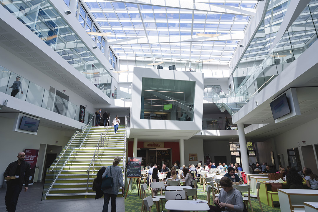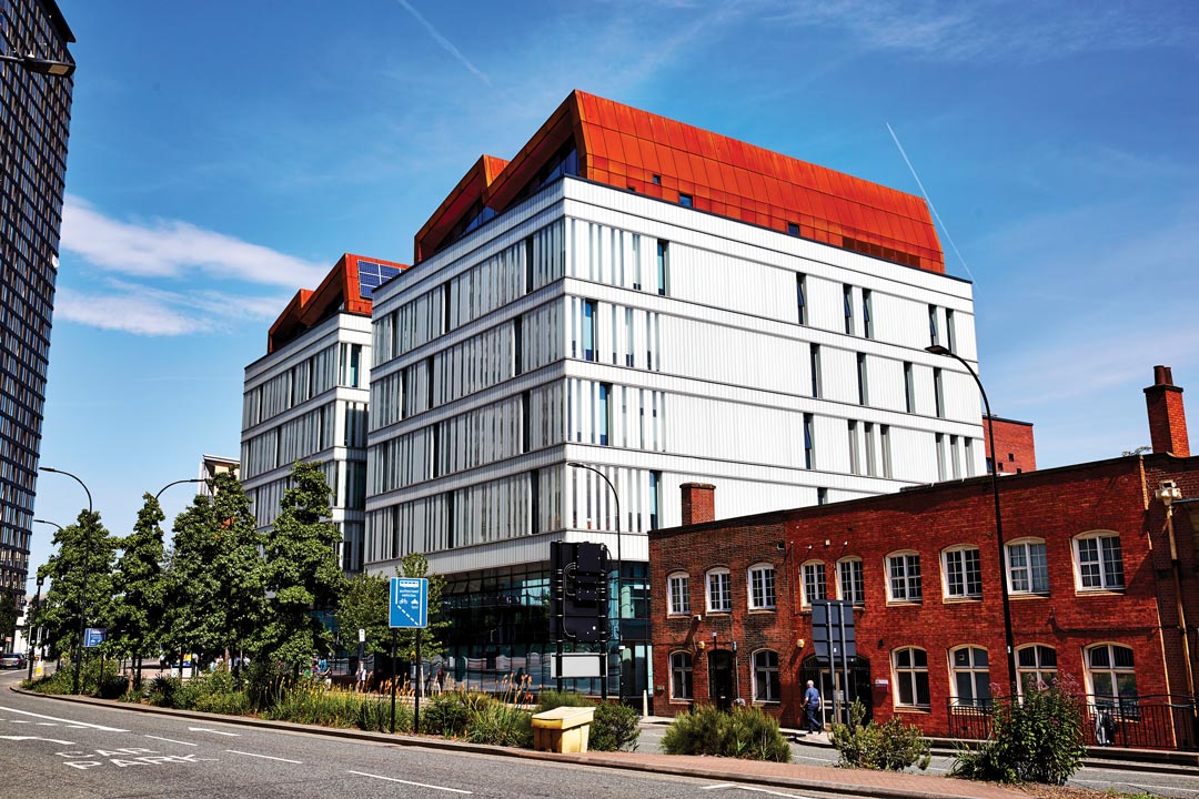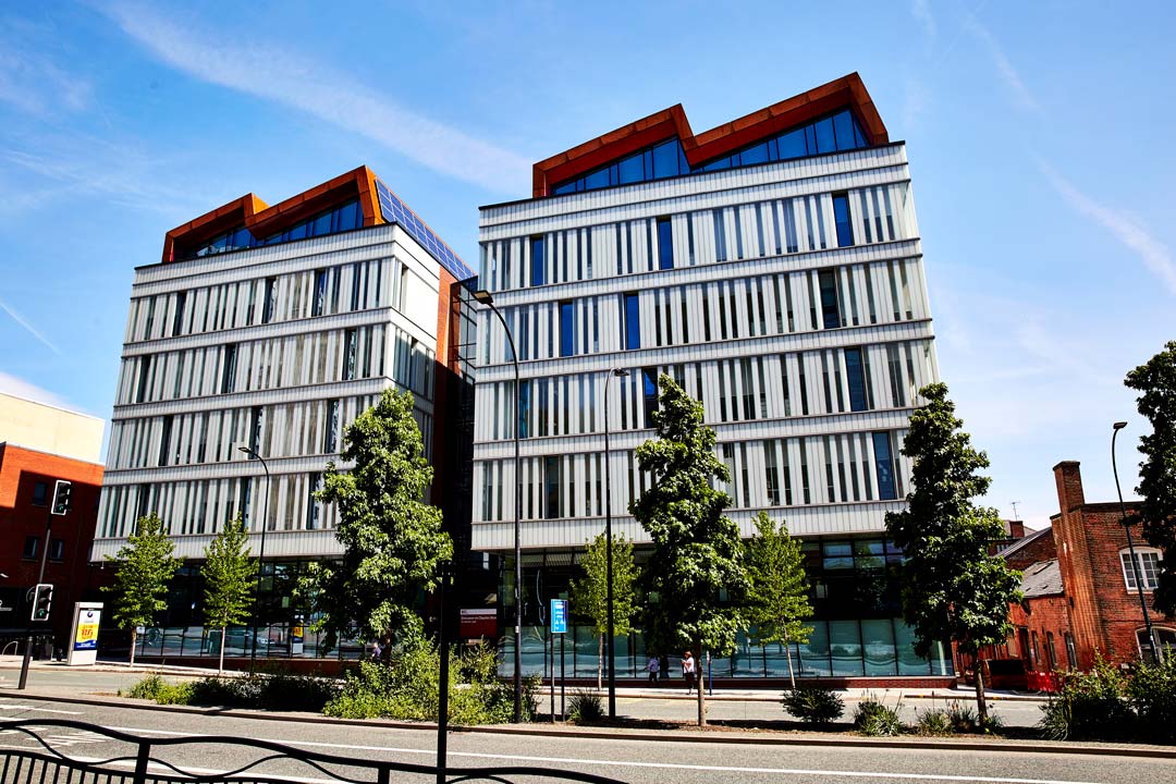 The exterior of the Owen building at Sheffield Hallam City Campus with clear blue skies overhead